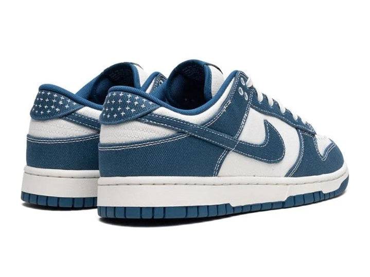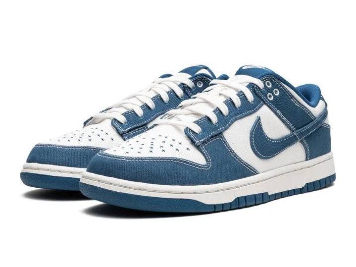 The upper combines white canvas with deep blue suede overlays, finished with the signature Sashiko stitch on the toe box and heel tab. The industrial blue and white colors offer a fresh look that can be effortlessly paired with ripped jeans or an oversized Essentials hoodie . The classic rubber cupsole and padded tongue also provide the familiar comfort that the Nike Dunk Low is known for.
